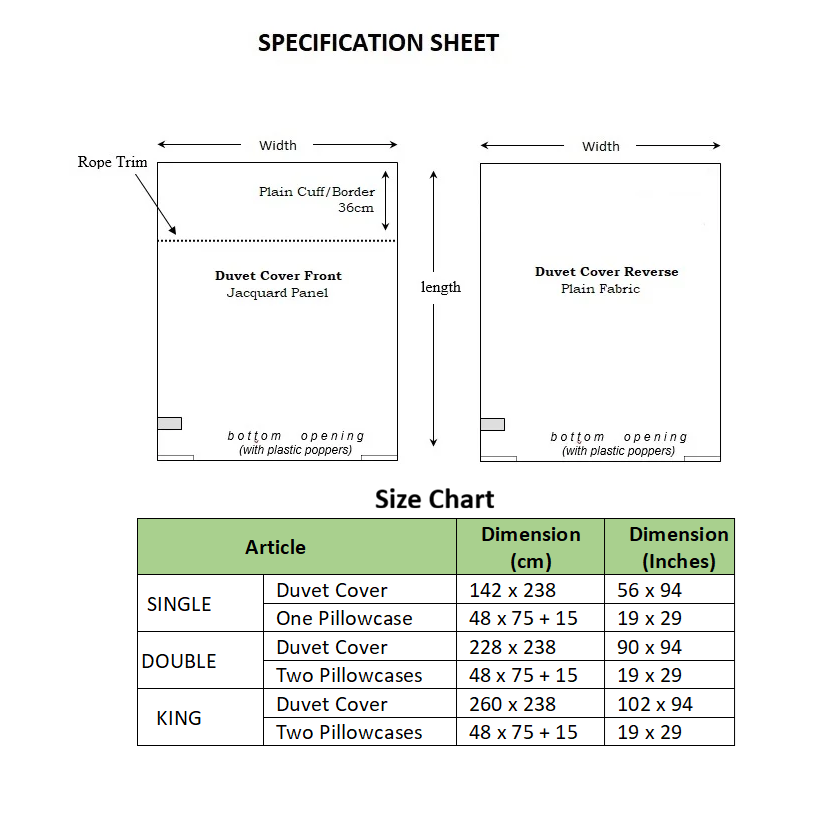 | Duvets Size | SINGLE 142cm x 238cm, DOUBLE 228cm x 238cm, KING 260cm x 238cm |